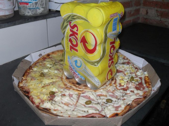 Voliamo già alti nel cielo delle assurdità più devastanti con la pizza guarnita con una cassa di birra. Cioè, alla fine mangi e bevi insieme, cosa vuoi di più? Ammesso e non concesso che le birre si debbano bere e non mangiare.