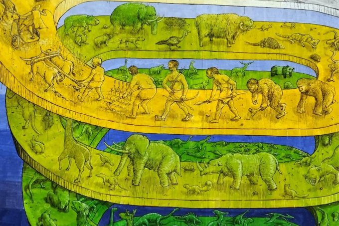 Nel murales, si vede una spirale che racconta la storia della vita sulla Terra, dai primordi in cui gli esseri viventi si trovavano solo in acqua, passando per il successivo approdo sulla terraferma e poi seguendo tutto il percorso evolutivo delle varie specie, dinosauri compresi.