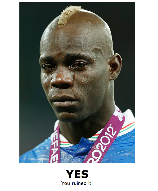 Ieri sera, nell’estasi del furore agonistico, durante la partita Milan – Napoli, Balotelli ha sbagliato il primo rigore da professionista. Pepe Reina, spagnolo e noto armadio, da deviato in angolo il tiro troppo centrale di SuperMario. E’ finita 2 a 1 per i partenopei e Mario si è pure beccato il cartellino rosso a fine gara per aggressività nei confronti dell’arbitro. Ma il punto è un altro: pochi minuti dopo l’errore dal dischetto è apparso online http://hasbalotellimissedapenalty.com! Come si fa a non adorare certi geni?