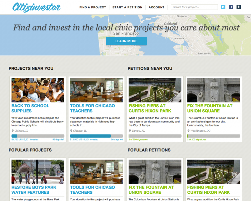 Citizinvestor, ad esempio, è un sistema di crowfounding sul modello vincente Kickstarter, incentrato però su progetti civici prettamente locali. In cui si possono proporre sia petizioni che progetti concreti (o petizioni che raggiunto un certo numero di adesioni diventano progetti). Esempi? Il comune di Philadelphia sta cercando 12mila dollaroni per piantare 15mila alberi.