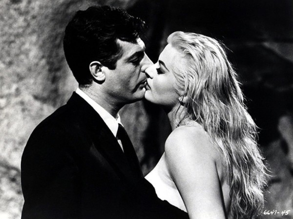 Anita Ekberg e Marcello Mastrianni in una scena del film “La Dolce Vita“, di Federico Fellini. Il film è del 1960, Marcello è un giornalista che racconta i vizi dei divi della Roma del cinema di quegli anni. Anita nel film è Sylvia, una famosa attrice che Marcello intrattiene in un locale della capitale, all’uscita lei è euforica e quando vede la fontana di Trevi vi si immerge iniziando una leggiadra danza. Marcello vince la timidezza ed entra a sua volta nella fontana. Quando lui la riaccompagna in hotel incontra però il fidanzato di lei che, prima schiaffeggia Sylvia ed in seguito affronta Marcello, stendendolo con un pugno davanti ai fotografi che immortalano la scena.