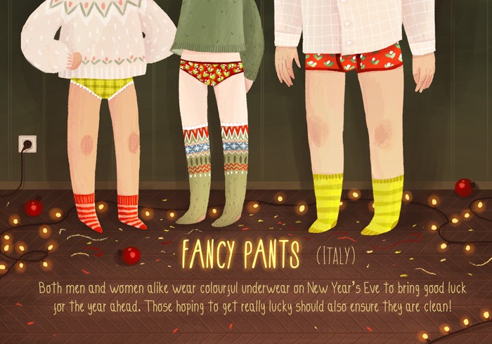 Uomini e donne indossano mutande colorate per l’ultimo dell’anno, perché portino fortuna. In realtà, perché il miracolo avvenga. il colore dev’essere tassativamente rosso.