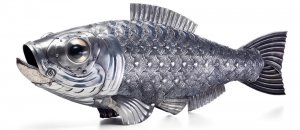 Il corpo del pesce qui sotto invece è stato fatto con le etichette di metallo delle bici, montate insieme a forma di squame. Un lavoro davvero faticoso, che ha portato a risultati fenomenali. È davvero incredibile come i materiali pesanti che usa, diventino eleganti nelle sue mani, che riescono a plasmarli come fossero creta.