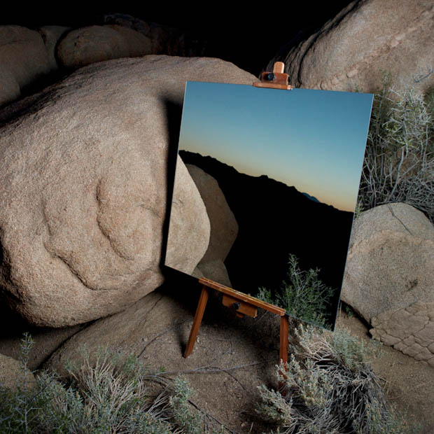 Daniel Kukla è un giovane fotografo Newyorkese appassionato di biologia, durante un lungo soggiorno nel Joshua Tree National Park in California inventa questo bizzarro modo di utilizzare il paesaggio per fare da cornice ad un finto quadro realizzato con uno specchio. Lo specchio riflette un’altra parte di paesaggio non visibile direttamente nella foto. Così mette in contrapposizione due ambienti diversi, due ecosistemi diversi, cosa che – in gergo naturalistico – è detta Edge Effect. Da qui il titolo di questa gallery in cui uno specchio fotografato in un ambiente naturale riflette un paesaggio e sembra un dipinto iperrealista. Il resto degli scatti sul sito di Kukla.