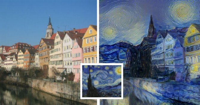 Tecnicamente il processo si chiama “apprendimento profondo” ed è un algoritmo già utilizzato da Google per riconoscere le immagini. Nelle foto qui sotto, alcuni appartamenti sul fiume a Tubingen sono stati processati per somigliare a dipinti di famosi artisti come J.M. Turner, Vincent Van Gogh o Edvard Munch, oppure foto prese a caso (Emma Watson e Gandalf) nello stile di Picasso.