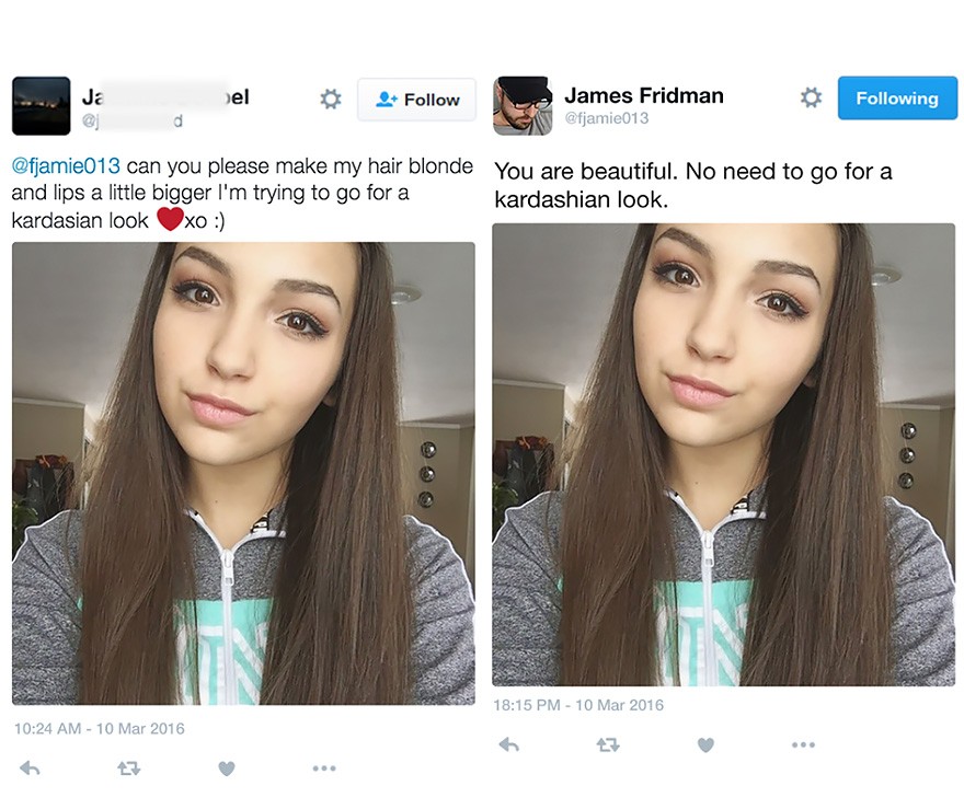 Potresti farmi i capelli biondi e le labbra più grandi, vorrei somigliare alla Kardashian? – Sei bellissima, non ne hai bisogno.