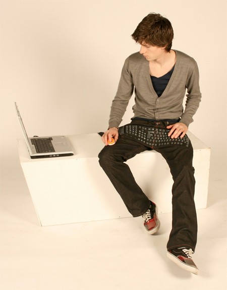 L’idea del designer Erik de Nijs è molto semplice, come potete notare: i tasti fuoriescono dal tessuto e consentono di scrivere poggiando comodamente (?) le mani sulle gambe; il mouse, ovviamente wireless come la tastiera, è collegato a un pezzo di stoffa e può essere infilato in una delle tasche posteriori; all’altezza delle ginocchia sono invece collocati due piccoli speaker.