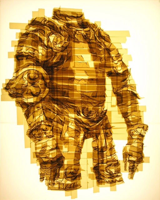 Le tecniche per disegnare sono infinite e questa è tra le più bizzarre mai viste. Mark Khaisman è l’autore di queste opere, è nato a Kiev nel 1958, ma si è poi trasferito a Philadelphia. Nella sua vita, immagino, deve aver fatto parecchi traslochi, perché disegna con il nastro da pacchi, quello marrone che si usa per chiudere gli scatoloni di cartone e con cui il più delle volte le persone normali litigano durante il trasloco perché si accartoccia.