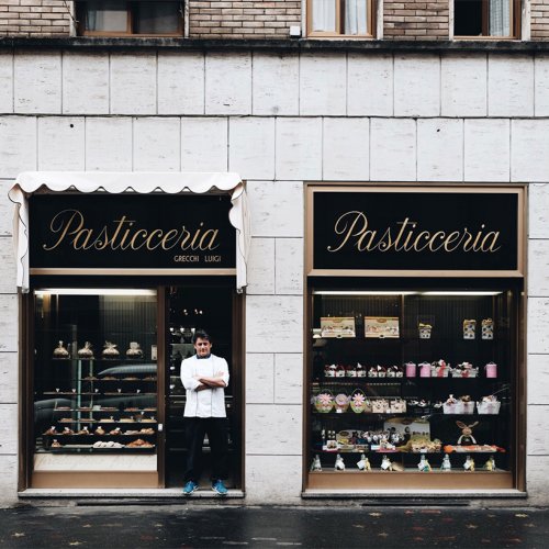 Antonio Grecchi di fronte alla sua pasticceria, foto © Marco Valmarana / Pixartprinting.com