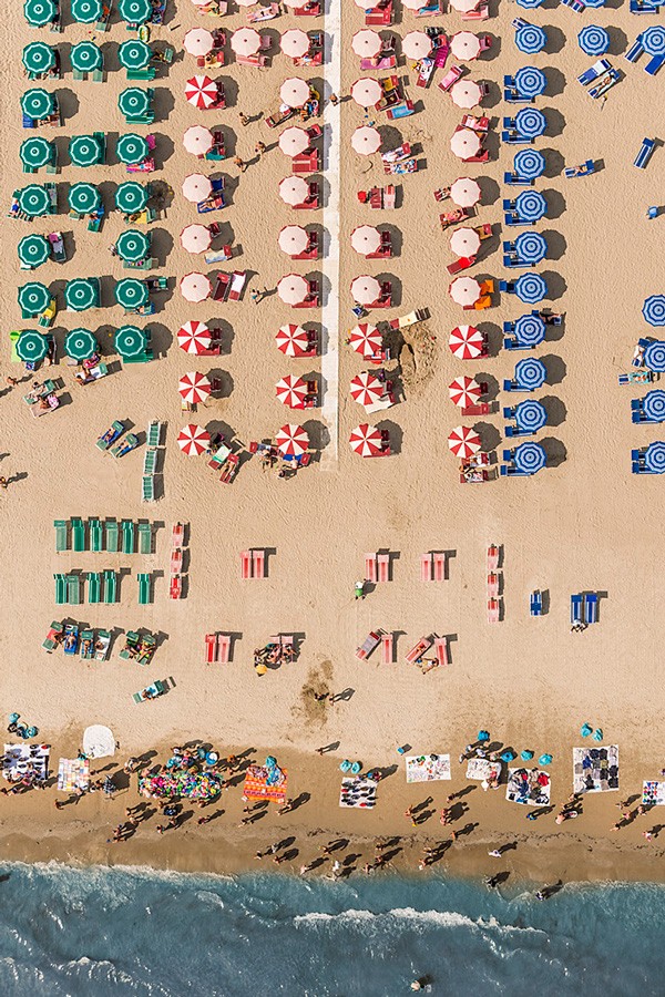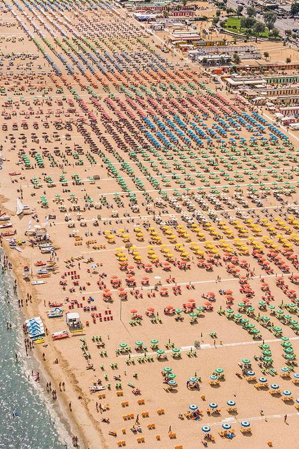 Numeri che si toccano con mano quando si è schiacciati su una spiaggia, ma che saltano ancora più all’occhio facendo una ricognizione aerea della riviera. È proprio questo il senso di Aerial Views Adria, serie firmata da Bernhard Lang, fotografo bavarese che ha fatto degli scatti aerei la propria cifra stilistica. Fotografie scattate dall’alto, spesso perfettamente a piombo rispetto al soggetto, che evidenziano geometrie difficilmente immaginabili e rendono le figure umane solo un piccolo particolare.