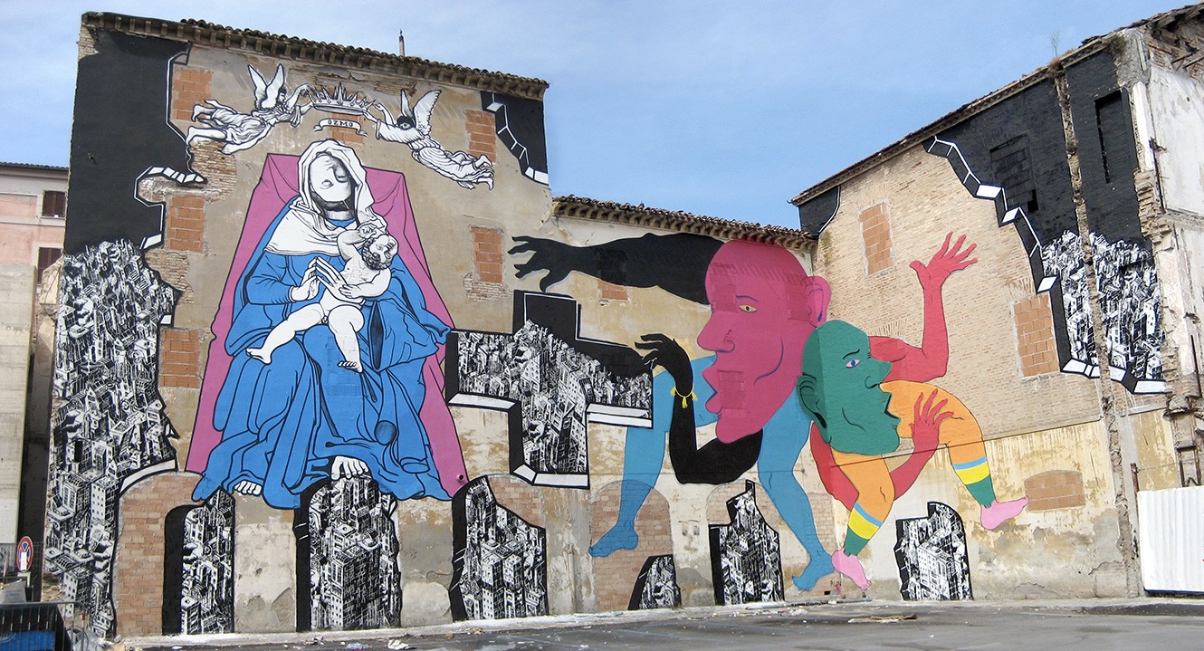 La Madonna con Bambino e teste sotto sopra che ha movimentato Ancona con un esposto da parte dell’opposizione e la presa di posizione a favore da parte dell’Arcivescovo di Osimo, massimo esperto di iconografie sacre che ha difeso l’opera dall’accusa di blasfemia.