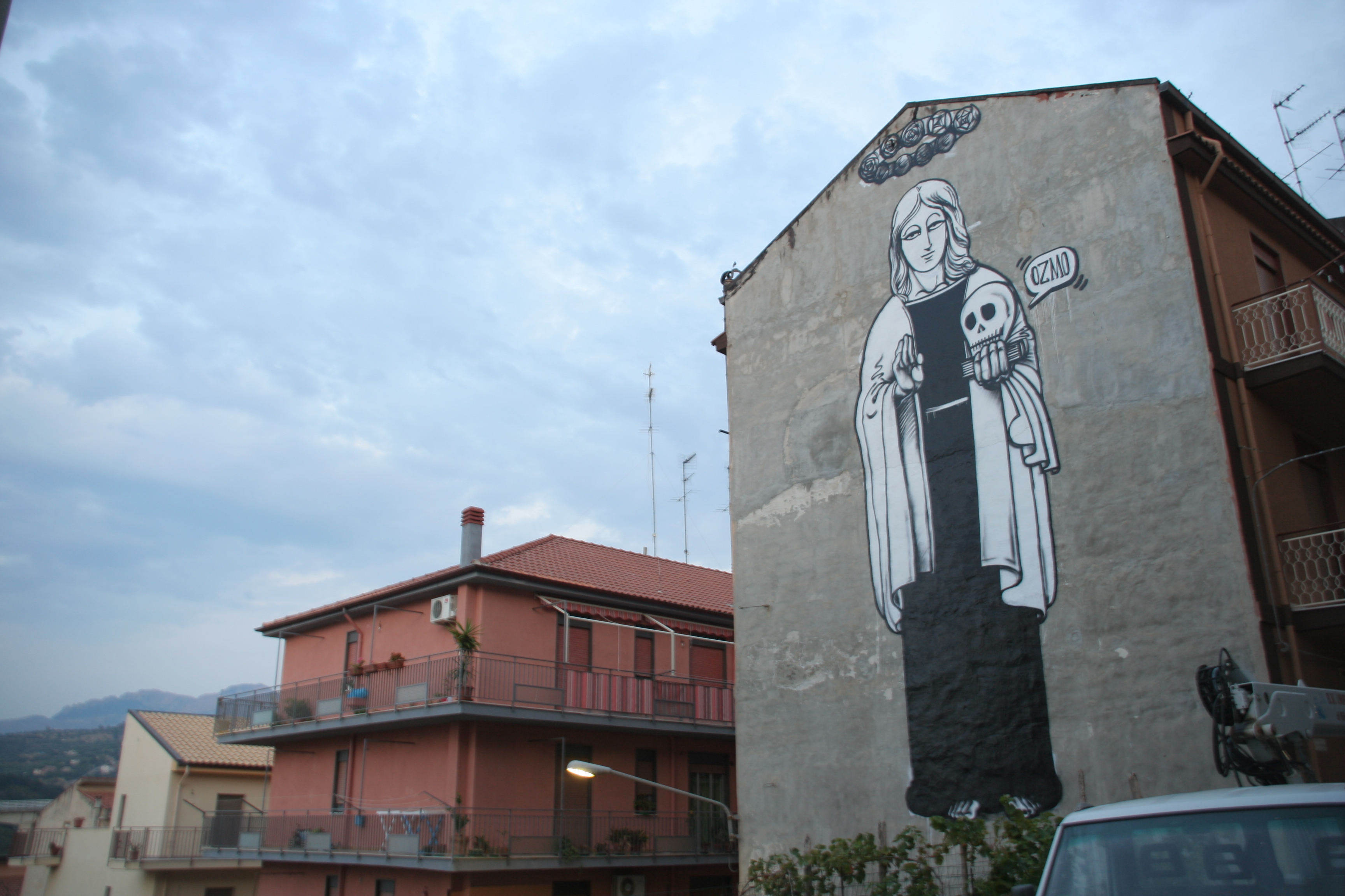 La prima opera monumentale site specific in uno pseudo festival di street art in Italia: era il 2008 ed era il primo a Campofelice di Roccella (Pa). L’opera era al contempo un iconografia di Ozmo (per il teschio), il ritratto della proprietaria (che si chiama Rosalia) e un omaggio a Santa Rosalia patrono di Palermo