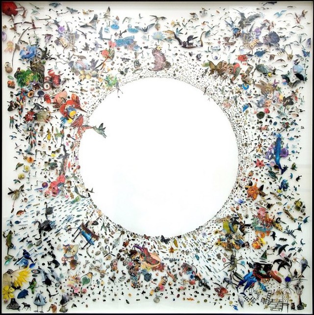 Recupera immagini da vecchie enciclopedie, o foto dal National Geographic o libri di natura e ne crea collage e patchwork che sono una via di mezzo tra opere su tela o gigantografie fotografiche.