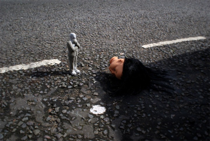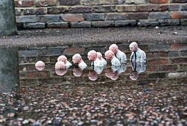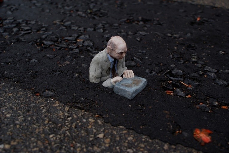 Isaac Cordal ha creato così tristissimi pupazzetti di cemento, alti circa 25 centimetri, che si camuffano tra strade e palazzi, con lo scopo di far emergere l’annullamento del ruolo del cittadino sulle decisioni architettoniche delle aree urbane.
