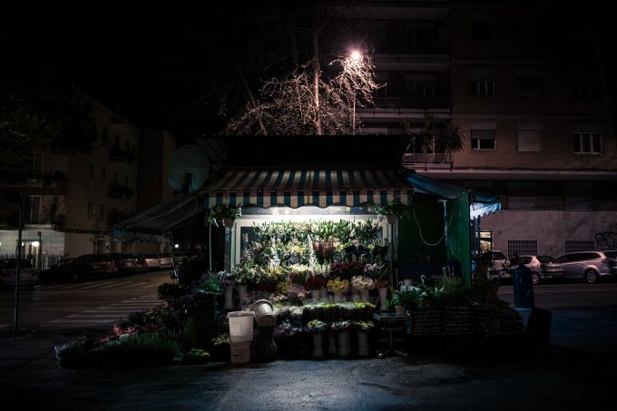 Come scrivo sul mio sito, pochissimi esercizi commerciali sono aperti a Roma di notte: qualche bar, qualche negozietto, i benzinai self service e molti chioschi di fiori. Li puoi trovare in ogni quartiere e non chiudono mai. La loro presenza mi ha sempre affascinato e incuriosito, mi sembrano sentinelle della tranquilla notte romana. Mi sono deciso a girare la città per raccontarli.
