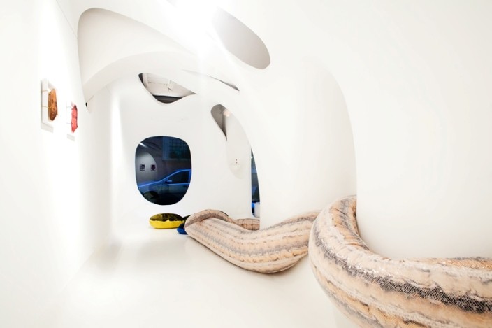 Bisogna entrarci almeno una volta nella vita. Perchè Ex Elettrofonica, Vicolo Sant’Onofrio a Roma, è davvero uno spazio magico, dove nascono sensazioni che stimolano l’immaginazione. Il progetto architettonico è di Federico Bistolfi e Alessandra Belia. A trovare gli artisti giusti per mostre e progetti sono invece Beatrice e Chiara Bertini. Brave e simpaticissime. Il consiglio: passate e date un’occhiata alla mostra Ouroborus di Stefano Minzi (a cura di Manuela Pacella) e non ve ne pentirete. L’artista propone un lavoro inedito che trova il suo cuore in un grande serpente di stoffa che gira intorno all’albero centrale della galleria. Il serpente, simbolo dell’infinito e dell’eterno ritorno, ha 4 teste di stoffa di 4 colori e grandezze diverse. Il più piccolo e lontano nel tempo è Mussolini, stampato su stoffa blu perchè, nell’accezione negativa del colore, simboleggia la tirannide. Poi vengono Craxi – verde per l’invidia – e Andreotti – giallo di follia. Infine (poteva mancare?) Berlusconi, il più grande perché il più recente. E bianco, come l’egoismo. La mostra resta aperta fino al 3 marzo. Orari: dal Martedì al Venerdì 12.00 – 15.00 l 16.00 – 20.00, Sabato su appuntamento, Domenica e Lunedì chiuso. ph | fax: 06.64760163