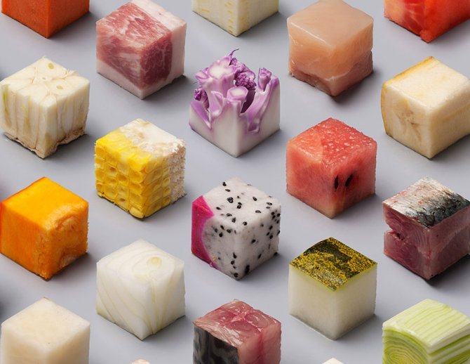 Melanzane, melograno, cavolo, kiwi, melone, arancia, anguria. Sono solo alcuni dei cibi che gli artisti olandesi Lernert e Sander hanno tagliato in cubi di dimensioni 2,5 cm per lato. Precisissimi.