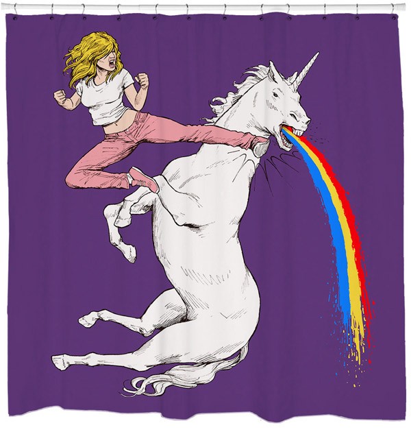 La tenda da doccia con Barbie che mette KO un unicorno.