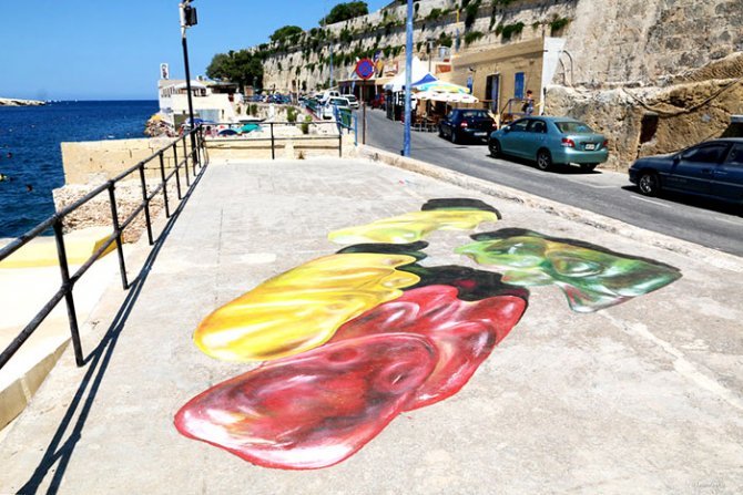Il pittore di strada olandese Leon Keer (qui in Italia si chiamerebbe madonnaro), specializzato in pittura 3D, ha realizzato questo orsetti gommosi giganti per il Malta Street Art Festival.