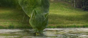 Nelle immagini di Saunders Tolly si trasforma così in sontuosi cespugli verdi e si gode la campagna inglese in giardini rigogliosi, magari bevendo acqua da uno stagno come se fosse una ciotolina, o dormendo placido su un fianco.