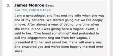 “Sono un ginecologo e ho conosciuto mia moglie perché era una mia paziente. Abbiamo iniziato ad uscire insieme e ci siamo terribilmente innamorati. Dopo quasi un anno, lei venne da me per un esame vaginale e io le dissi “Ho trovato qualcosa!”, fingendo di estrarre l’anello di fidanzamento dalla sua vagina. Le ho chiesto se voleva sposarmi, lei ha risposto di sì e viviamo sposati e felici da quel giorno.”