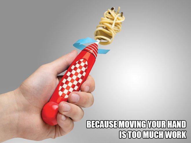 Parliamo di cose serie: che fatica arrotolare gli spaghetti con la forchetta. Quel tempo sembra infinito e poi ci fa male il braccio, che non ha fieramente mai visto un giorno uno di palestra. Ma grazie alla forchetta a motore di Hog Wild, anche quell’atto fin troppo stancante può essere evitato: