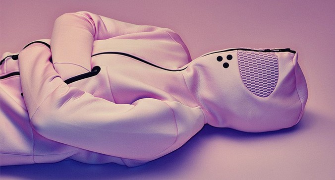 Sposando la teoria di Schnauss, si sono chiesti di cosa avesse bisogno un atleta prima di iniziare una gara e la risposta è la più semplice: di calma. Dopo qualche studio sul sistema nervoso parasimpatico, quello che fa rilassare il corpo, hanno deciso di progettare una felpa che, grazie alla visiera a rete, desse una colorazione rosa (rigorosamente Baker-Miller) a tutto il mondo che ci circonda e che fosse anche una specie di grotta, dalla quale si possa vedere tutto senza essere visti. La felpa pare incoraggi l’atleta a respirare col naso perché i fori di posizionati sulla bocca sono di sola uscita e a non esercitare più energia del necessario, grazie alle tasche posizionate in stile di camicia di forza. Tutto per mantenere uno stato di calma totale, altrimenti non raggiungibile. A patto che vi piaccia indossare una camicia di forza rosa, chiaro.