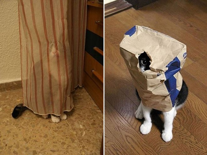 Dai, stiamo scherzando. Però guardando le seguenti foto, viene davvero da chiedersi cosa spinga i gatti al nascondismo, al travestitismo, agli attacchi furtivi, ad acrobazie ai limiti delle loro possibilità, oppure al cercare rifugio nelle scatole di cartone.