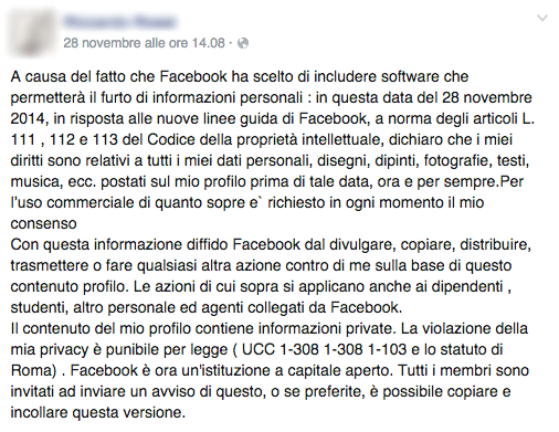 Un altro appuntamento imperdibile per gli abitudinari dell’internet è il momento in cui Facebook annuncia un cambiamento delle regole della privacy. Nell’arco di poche ore i feed di tutti si riempiono di annunci in cui utenti di ogni età, sesso, razza e religione dichiarano che no, loro non ci stanno a sottostare alle regole di Facebook e che no, Mark Zuckerberg non deve permettersi di usare le foto che hanno caricato. È successo tante volte, è successo di nuovo in questi giorni, dopo che Facebook ha anticipato che dal primo gennaio ci saranno alcune (piccole) modifiche legate alla privacy.