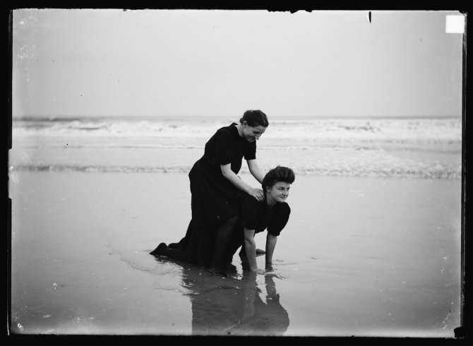 1900 circa: due ragazze giocano alla cavallina sulla spiaggia di Atlantic City