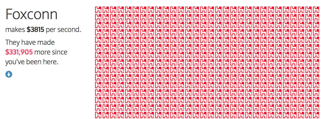 La pagina è molto molto chiara, a prova di indignados tantopiù che – rimanendo sulla pagina – si vedono scorrere in tempo reale secondi/migliaia di dollari nelle tasche delle varie Foxconn, Apple, Microsoft, Nokia etc > guarda quanti soldi fanno al secondo le aziende tech più famose.