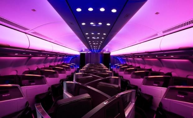 Se con Swiss Air era tutto puntato sul relax, Virgin Atlantic gioca tutto sull’interazione e sul divertimento: cocktail bar, area lounge per chiacchierare con gli altri viaggiatori, possibilità di inviare sms e un letto circondato da Swarowski.