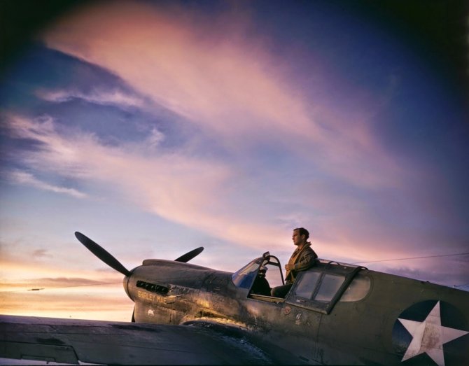 Un pilota americano sul suo aereo alla Midway Naval Base, Midway Islands, 1942