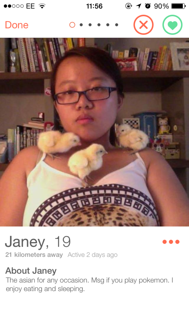 “L’asiatica per ogni occasione. Messaggiami se vuoi giocare a pokemon. Mi piace mangiare e dormire.”