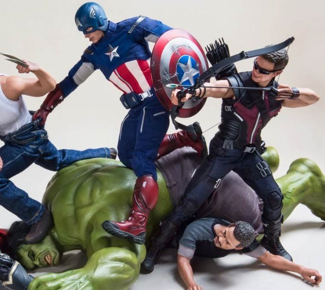 In queste foto, Thor, Joker, Wolverine e Spider-Man che fanno pipì al muro con Hulk e che gli guardano esterrefatti il suo incredibile coso. Oppure Thor, Hulk, Wolverine e Iron-Man al fast food con Batman, o mentre scaldano il cibo e accendono sigarette sulla testa infuocata di Ghost Riderì, fino ad arrivare alla bella dei Vendicatori che bacia un romantico Wolverine sulla guancia.