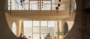 La residenza primaria di Arcosanti ha degli interni perfettamente in linea con gli esterni. Grandi finestre rotonde e un’architettura basica, che si integra col territorio.